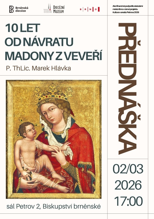Diecézní muzeum zve zájemce na přednášku P. ThLic. Marka Hlávky o obrazu Madony z Veveří. Přednáška proběhne v pondělí 2. března od 17 hodin v sále na Petrově 2.