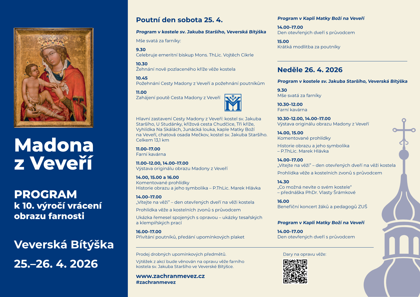 V sobotu 25. dubna proběhne ve farnosti Veverská Bítýška poutní den. Zahájí ho v 9.30 mše svatá v kostele sv. Jakuba Staršího, kterou bude celebrovat emeritní biskup Mons. ThLic. Vojtěch Cikrle. Po mši bude zahájena pouť s názvem Cesta Madony z Veveří, která má celkem 13,1 km. Na poutníky v jejím závěru čekají upomínkové plakety. Během dne bude vystaven originál obrazu Madony z Veveří a bude se konat i doprovodný program. V neděli 26. dubna bude program pokračovat mší svatou. I v tento den si bude možné prohlédnout originál obrazu Madony z Veveří a zúčastnit se bohatého programu dalších aktivit.