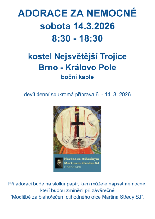 Farnost Brno-Královo Pole pořádá dne 14. 3. 2026 (sobota) od 8:30–8:30 adoraci za nemocné na přímluvu ct. o. Martina Středy SJ.
