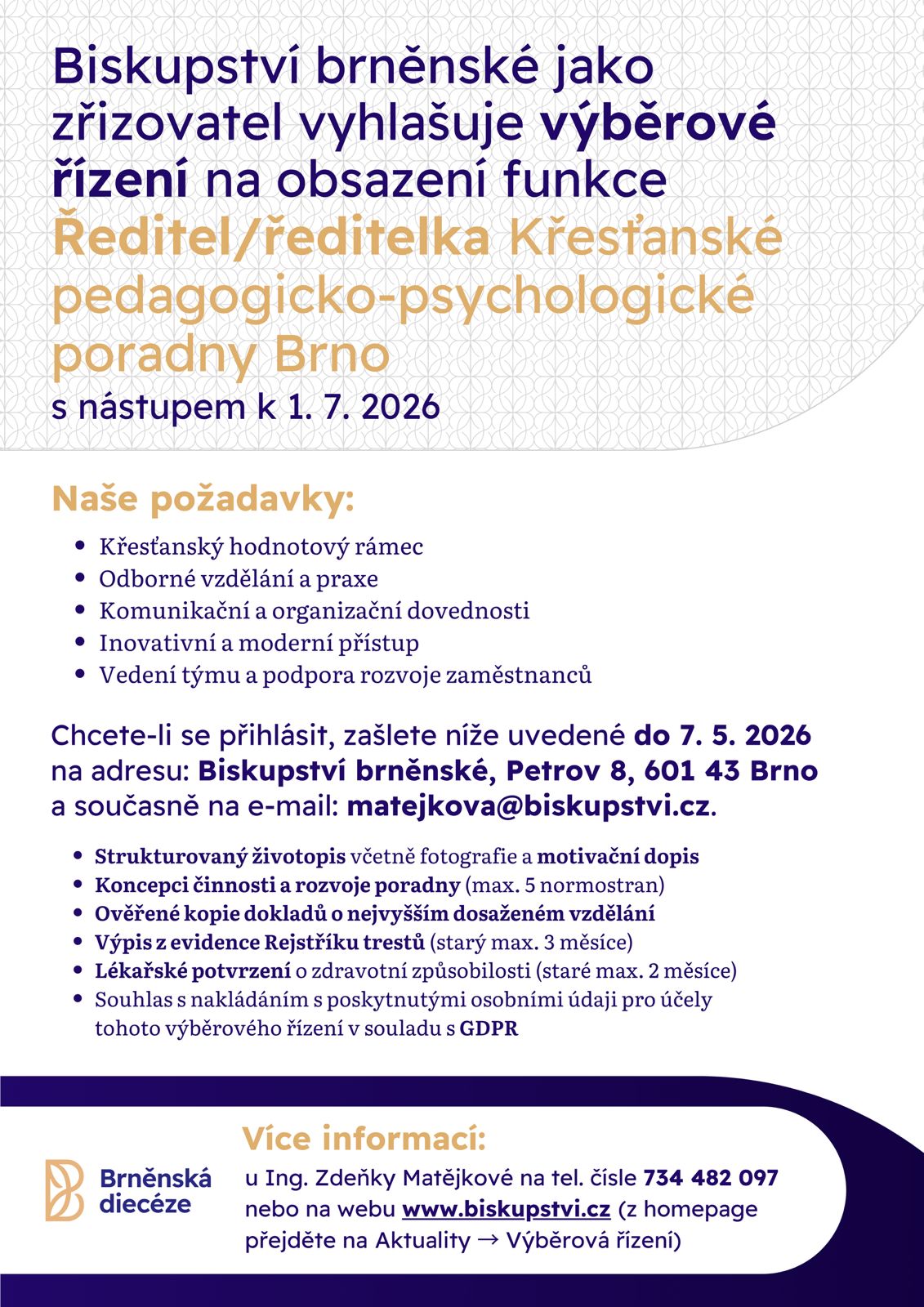 Chcete-li se přihlásit, zašlete níže uvedené do 7. 5. 2026 na adresu: Biskupství brněnské, Petrov 8, 601 43 Brno a současně na e-mail: matejkova@biskupstvi.cz.