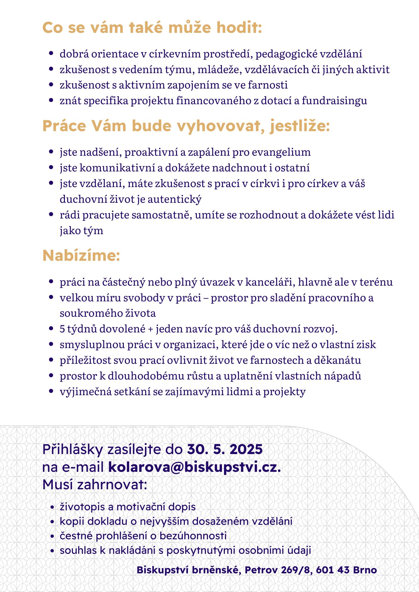 Přihlášky zasílejte do 30. května 2025 na e-mail: kolarova@biskupstvi.cz.