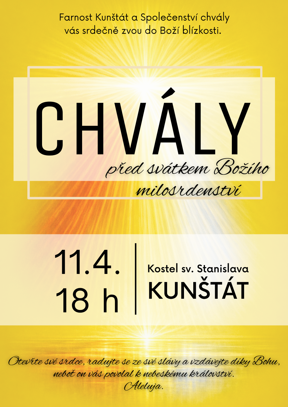 Na večer chval před svátkem Božího milosrdenství zve farnost Kunštát. Modlitba se uskuteční v kostele sv. Stanislava v sobotu 11. dubna od 18 hodin.