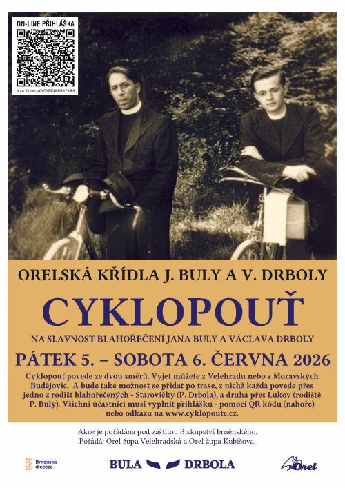 Organizace Orel zve všechny zájemce na cyklopouť, jejímž cílem bude červnová slavnost blahořečení Jana Buly a Václava Drboly na brněnském výstavišti. K pouti se můžete připojit ve dvou směrech: z Velehradu (cesta vede přes Starovičky) nebo z Moravských Budějovi (cesta vede přes Lukov), na příslušné trase se lze přidat kdykoli.