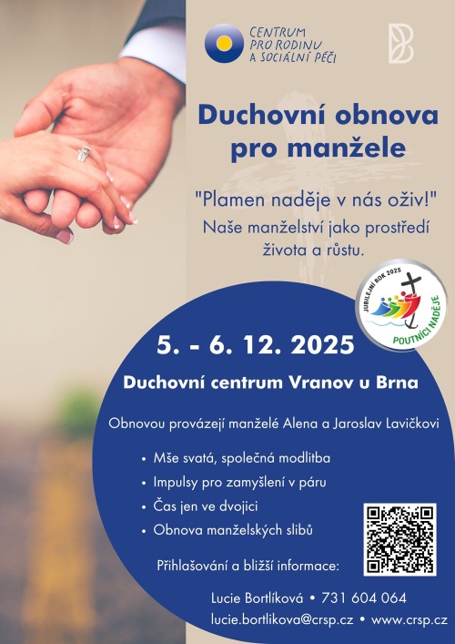 Centrum pro rodinu a sociální péči zve manželské páry na duchovní obnovu na poutní místo Vranov u Brna. Uskuteční se o prvním prosincovém víkendu 5. a 6. 12., průvodci budou manželé Alena a Jaroslav Lavičkovi. Přihlašování ZDE.