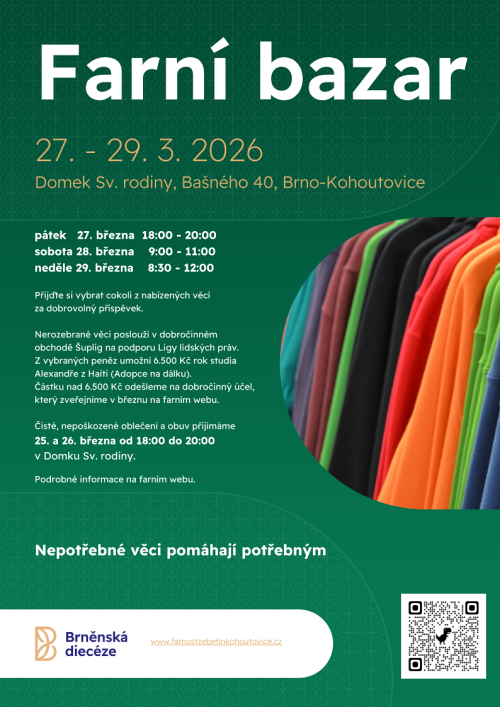 O posledním březnovém víkendu se v Domku Svaté rodiny v Brně-Kohoutovicíc uskuteční bazar oblečení a obuvi pro děti i dospělé. Výtěžek bude darován na projekt Adopce na dálku.