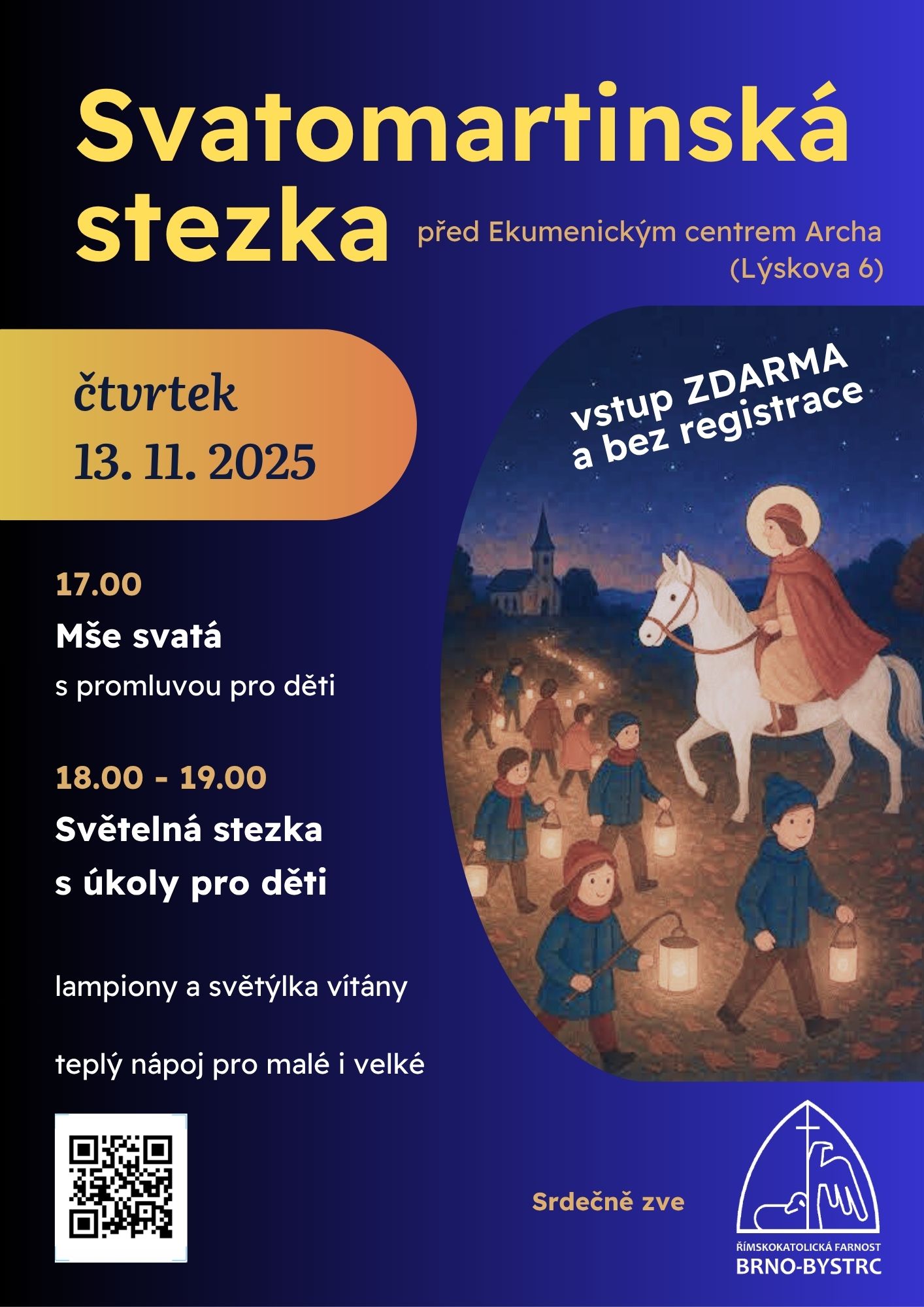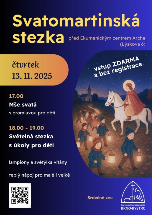 Ve čtvrtek 13. 11. 2025 srdečně zveme malé i velké na Svatomartinskou stezku, která se uskuteční u Archy. Nebudou chybět úkoly pro děti, drobná odměna, světýlka, teplý nápoj pro malé i velké. Lampiony a světýlka jsou vítány (masky ne). V případě nepříznivého počasí (silný déšť) akce proběhne ve skromnější verzi v prostorách Archy. V 17 hodin začíná mše svatá, v 18 hodin stezka pro děti.