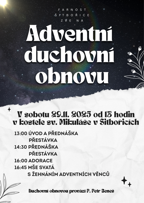 V sobotu 29. 11. 2025 od 13 hodin proběhne v kostele sv. Mikuláše v Šitbořicích Adventní duchovní obnova, která bude ukončena v 16.45 mší svatou.