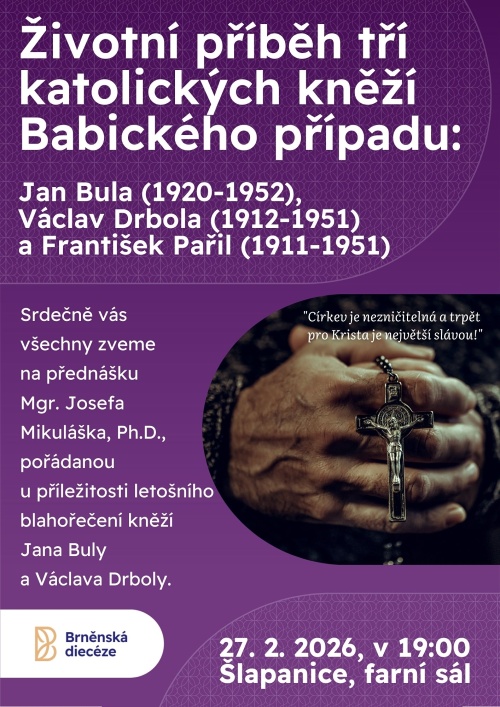 Na přednášku o třech kněžích spojených s babickými procesy jste zváni do Šlapanic. Přednáška Mgr. Josefa Mikuláška, PhD., se uskuteční v pátek 27. února od 19.00 ve šlapanickém farním sále.