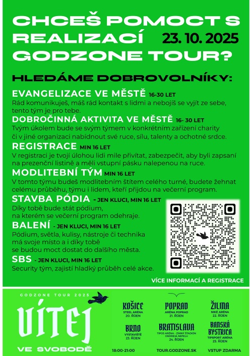 Modlitba a svědectví, hudba, tanec a divadlo. Propojení všech těchto prvků do jedné velké inovativní show přináší projekt GODZONE. Jeho cílem je evangelizace, šíření křesťanské víry mezi mladými lidmi dnešní doby. Godzone tour se letos koná v pěti městech na Slovensku a také v Brně.