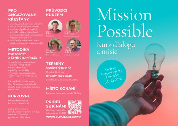 Přihlašování je možné ZDE. Termíny setkání: 17. ledna, 27. ledna, 10. února, 24. února, 21. března, 14. dubna na Lidické 24 v Brně v sídle Komunity Emmanuel. Kurz je za dobrovolný příspěvek, organizátoři prosí přihlášené, aby si pořídili zmíněnou knihu Mission Possible.
