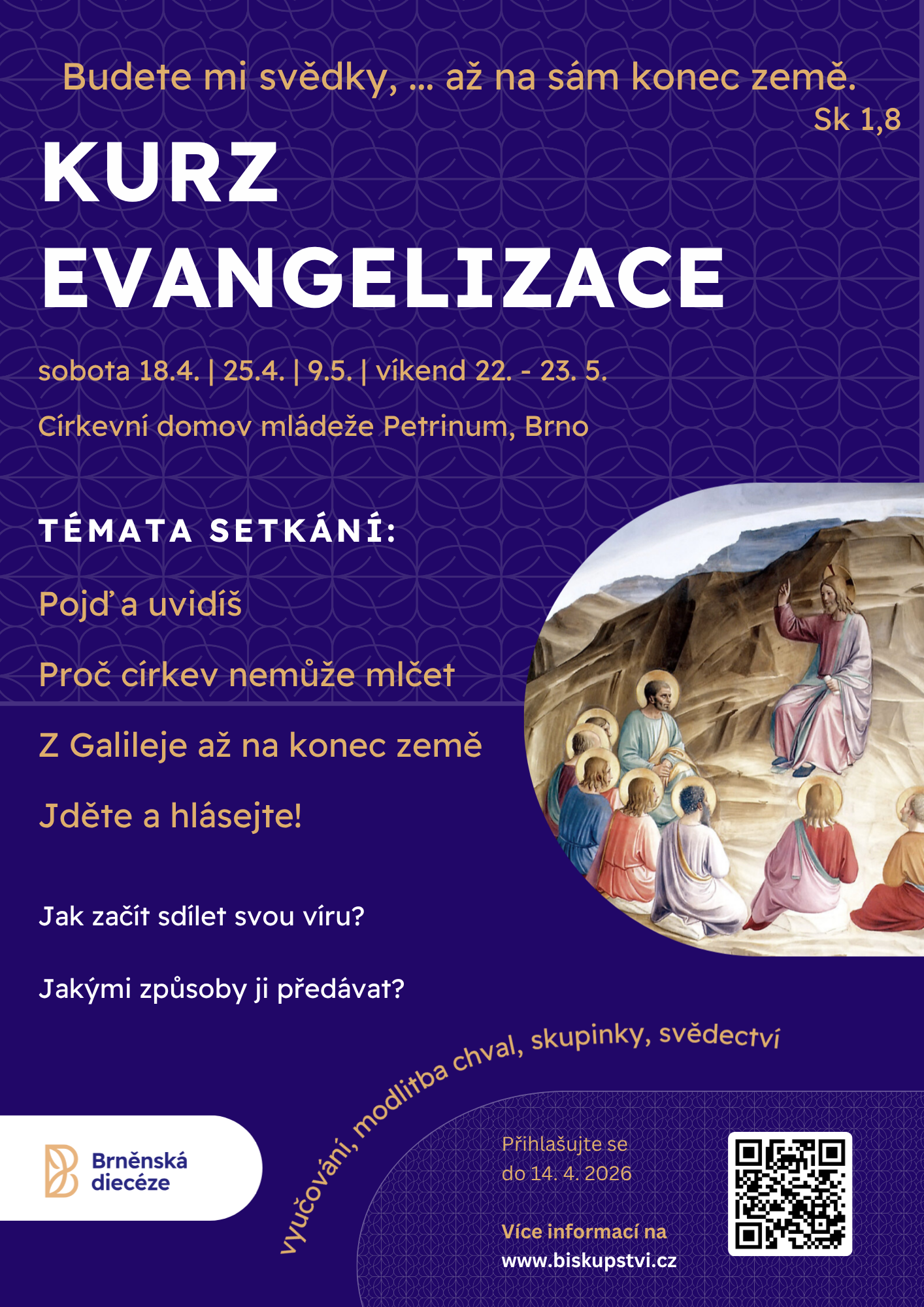 Toužíte sdílet s okolím svou víru a nevíte jak? Chcete předávat druhým radostnou zvěst evangelia a nejste si jistí, jak na to? Biskupství brněnské otevírá v polovině dubna kurz evangelizace. Na třech sobotních a jednom víkendovém setkání otevřete témata související s evangelizací, čeká vás modlitba chval, sdílení ve skupinkách a svědectví. Na kurz je nutné se přihlásit ZDE.