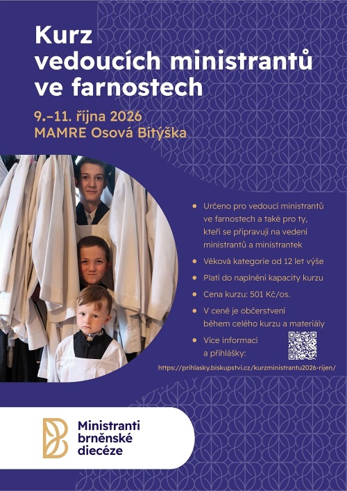 Víkendový Kurz vedoucích ministrantů je určen těm, kteří se chtějí připravit na vedení ministrantského kolektivu nebo jej už vedou anebo je tato problematika zajímá a chtějí se dozvědět víc. Je to víkend plný vzdělávání, modlitby, zábavy, radosti a společenství. Naleznete zde také spoustu dobrých kontaktů do budoucna. Koná se 9.–11. října 2026 v Diecézním centru života mládeže v Osové Bítýšce.