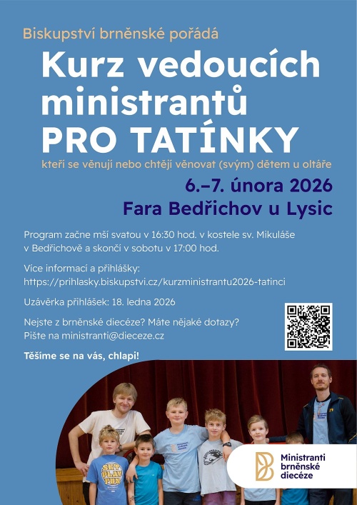 Na začátku února zveme na kurz vedoucích ministrantů pro tatínky, kteří se věnují (nebo chtějí věnovat) dětem u oltáře. Uskuteční se v Bedřichově u Lysic, 6.–7. února 2026.