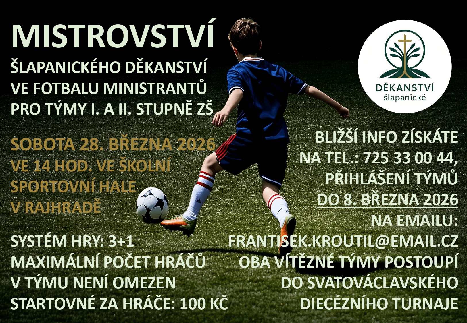 Kvalifikační turnaj ve fotbale pro ministranty I. a II. stupně ZŠ šlapanického děkanství se koná v Rajhradě ve školní hale v sobotu 28. března.