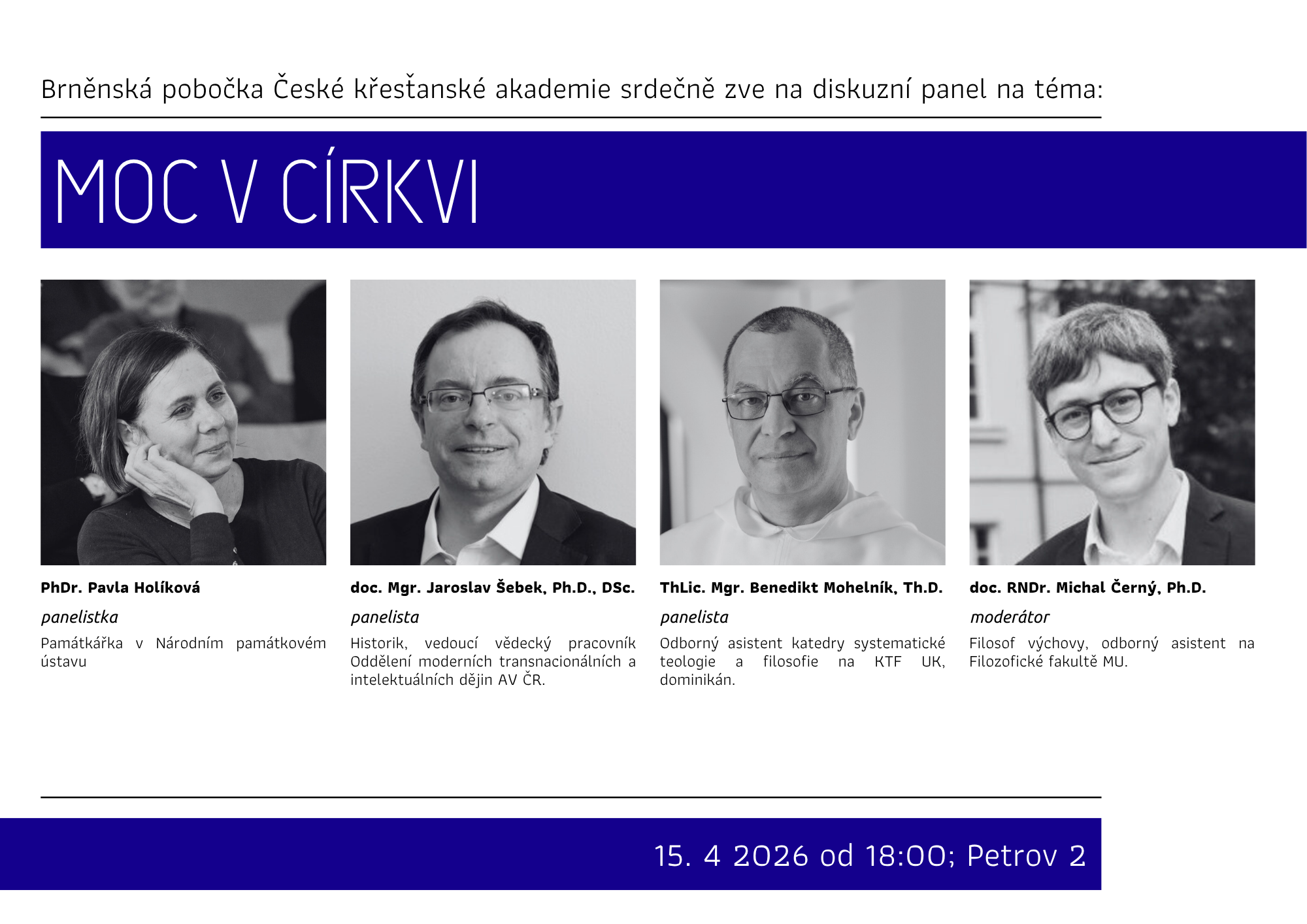 Brněnská pobočka České křesťanské akademie zve na panelovou diskuzi Moc v církvi. Pavla Holíková, Jaroslav Šebek a Benedikt Mohelník budou společně hledat odpovědi na povahu moci a mocenských vztahů v církvi. Od historických konsekvencí 19. století až po koncilní a pokoncilní vývoj. Důraz bude přitom kladen především na budoucnost – jak s mocí v církvi zacházet, žít, nezneužívat ji, jak nacházet tenkou hranici mezi službou a mocenskou pozicí. Moderuje Michal Černý. Diskuze proběhne v sále na Petrově 2 ve středu 15. dubna od 18 hodin.
