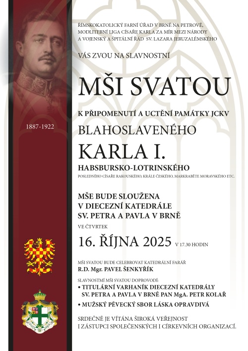 Ve čtvrtek 16. října se v katedrále na Petrově uskuteční mše svatá k připomenutí a uctění památky bl. Karla I. Habsburského, posledního císaře rakouského a krále českého. Mši svatou bude v 17.30 celebrovat P. Pavel Šenkyřík, hudebně doprovází varhaník katedrály MgA. Petr Kolař a mužský pěvecký sbor Láska opravdivá.