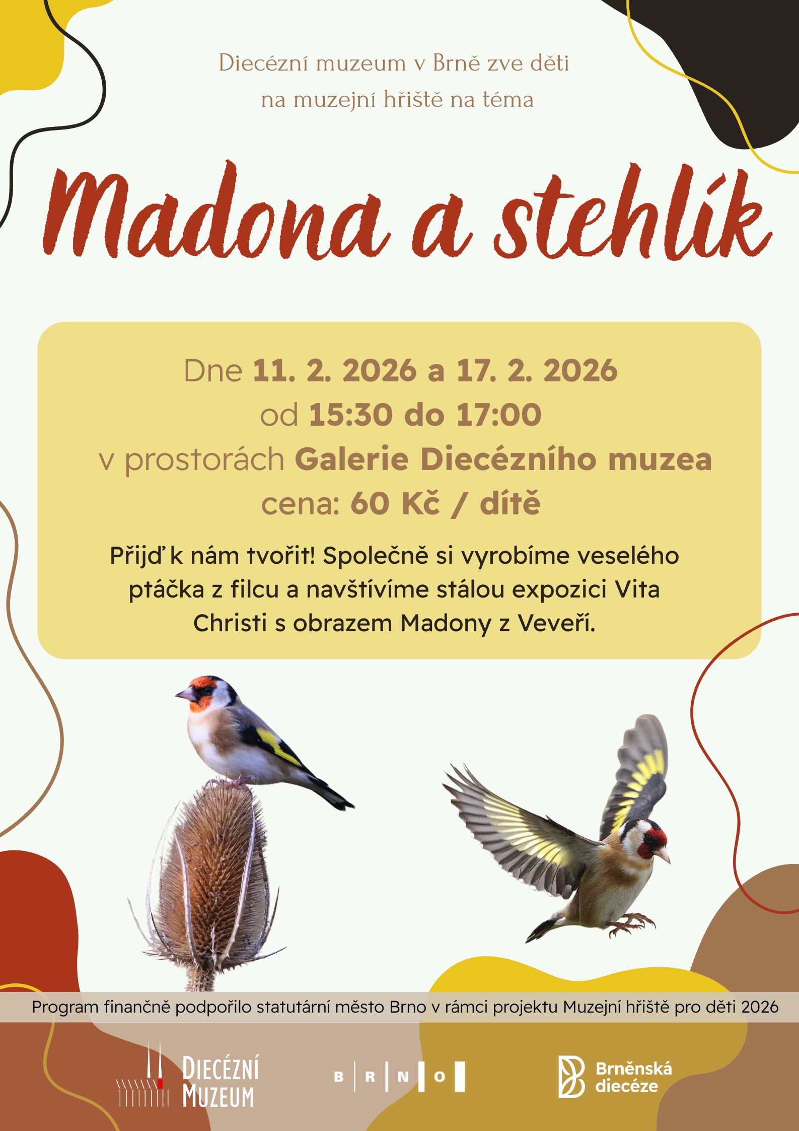 Diecézní muzeum v Brně zve na muzejní hřiště, které tentokrát nabídne tvoření veselého ptáčka z filcu a návštěvu stálé expozice Vita Christi s obrazem Madona z Veveří. Hřiště se koná v prostorách Diecézního muzea na Petrově ve středu 11. a v úterý 17. února vždy od 15.30 do 17.00. Cena: 60,-/dítě.