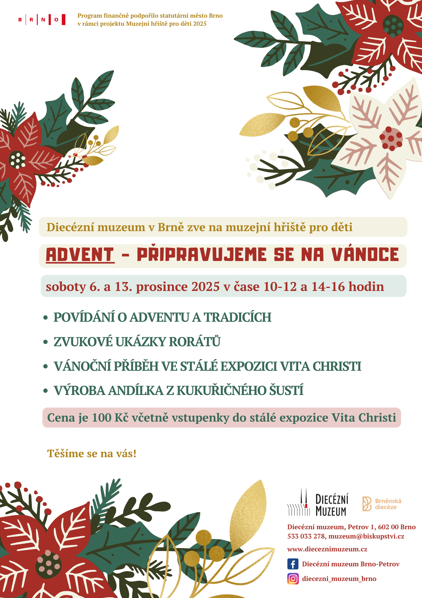 Diecézní muzeum pořádá tradičně v adventní době tzv. muzejní hřiště pro děti, na kterém si také letos mohou vyrobit závěsnou ozdobu andílka na vánoční stromeček. Děti s rodiči si mohou přijít andílka vyrobit v sobotu 6. a 13. prosince, mezi 10–12 a 14–16 hodinou. Kromě samotné výroby uslyší povídání o adventu, ukázky z rorátů a mohou objevit vánoční příběh v expozici Vita Christi. Na akci se není potřeba přihlašovat. Cena jedné vstupenky je 100 Kč.