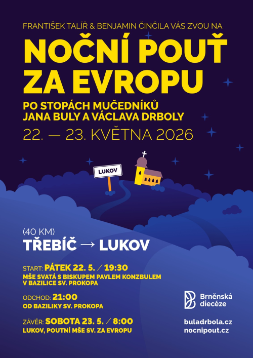 František Talíř a Benjamin Činčila zvou na noční pouť za Evropu – přidejte se ve dnech 22.–23. května 2026 ke společnému putování a modlitbě po stopách Jana Buly a Václava Drboly z Třebíče do Lukova (40 km).