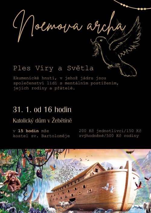 Ekumenické hnutí Víra a Světlo, které se věnuje pomoci lidem s mentálním postižením, pořádá ples v Katolickém domě v Brně-Žebětíně, v sobotu 31. ledna od 16 hodin. Téma: Noemova archa.
