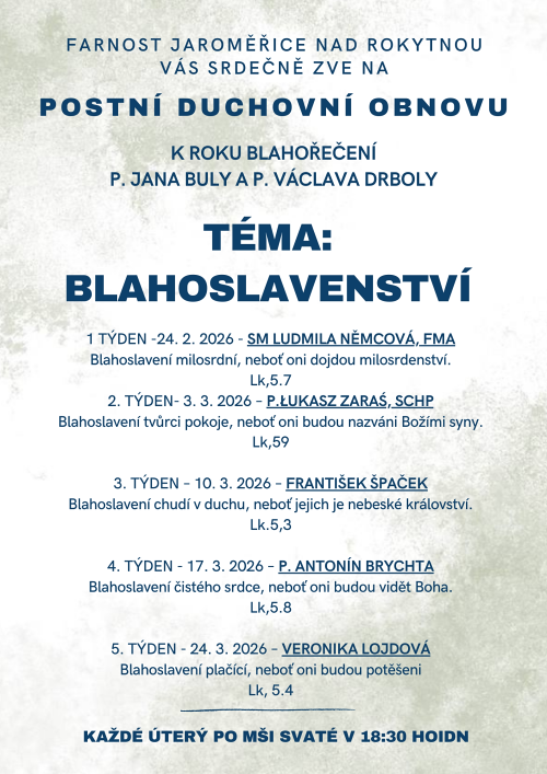 Každé úterý v postní době vás farnost Jaroměřice zve na postní duchovní obnovu na téma blahoslavenství. Začátek je vždy po mši svaté v 18.30.