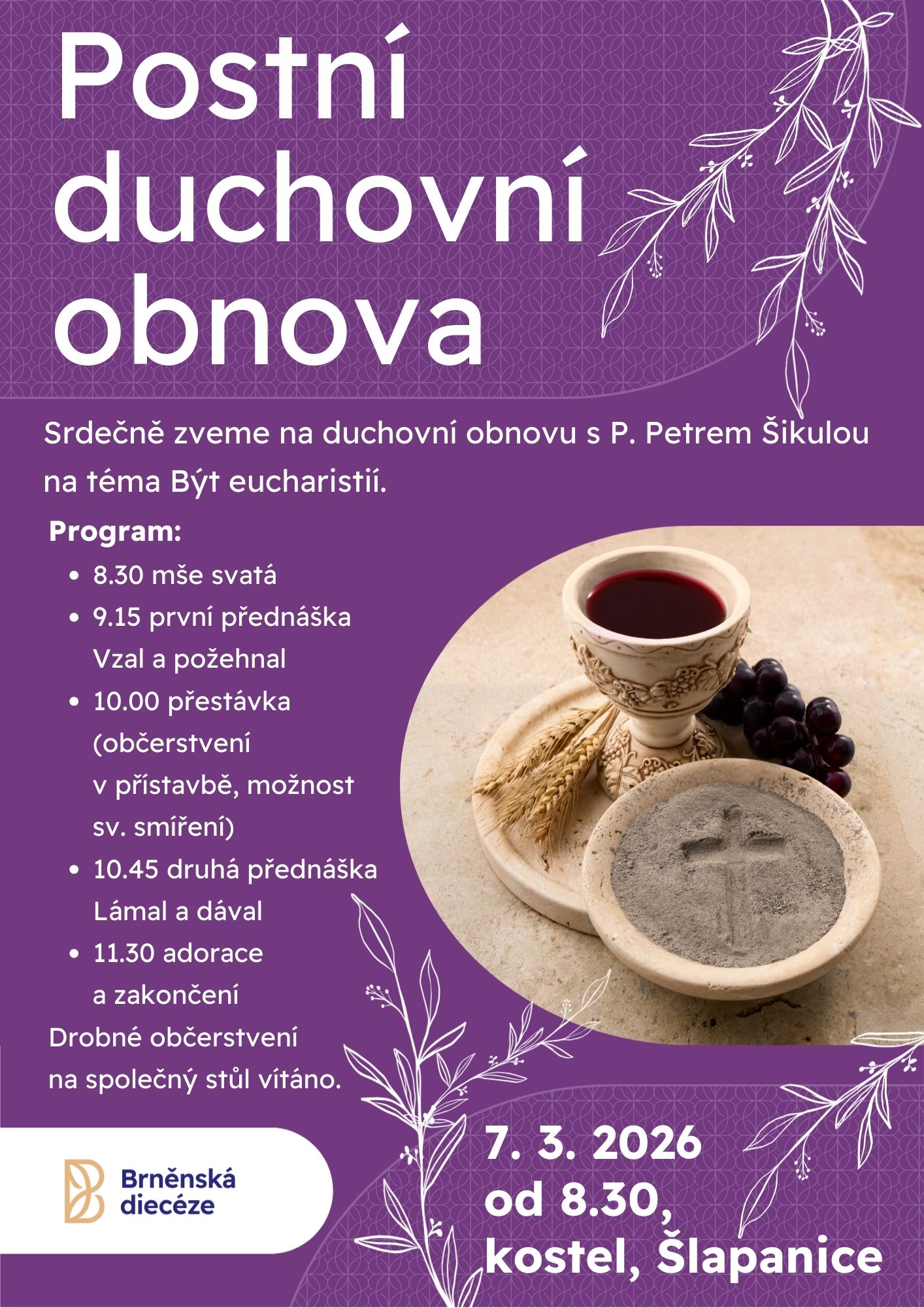 Srdečně vás zveme na postní duchovní obnovu s P. Petrem Šikulou na téma Být eucharistií, která se uskuteční 7. března 2026 od 8:30 v kostele ve Šlapanicích. Bližší informace na plakátku.