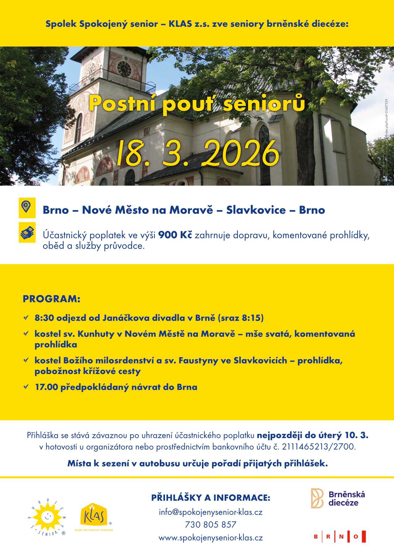 Spolek Spokojený senior – Klas z.s. zve seniory na postní poutní zájezd do Nového Města na Moravě a na poutní místo do Slavkovic, ve středu 18. března. Účastnický poplatek 900,-. Přihlášky na e-mailu? info@spokojenysenior-klas.cz nebo na tel.: 730 805 857.