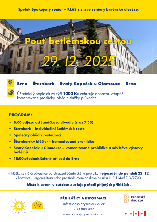 Spolek Spokojený senior - KLAS zve seniory brněnské diecéze na pouť do Šternberka a na Svatý Kopeček u Olomouce. Poutní zájezd se koná v pondělí 29. prosince, přihlášku je potřeba poslat nejpozději do pondělí 22. 12. Účastnický poplatek je 1000,-. Přihlášky a informace ZDE.