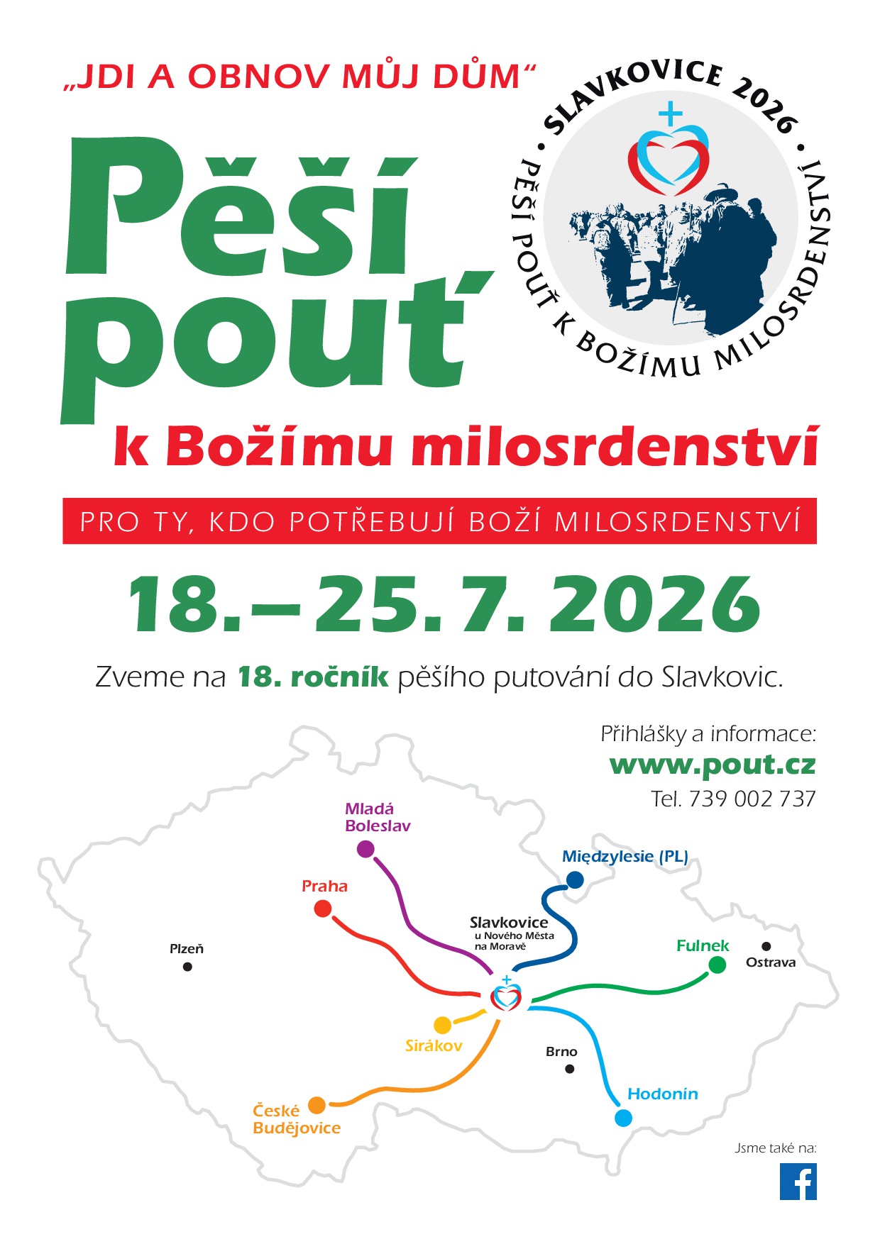 Heslem letošního putování bude „Jdi a obnov můj dům“. Jsou to slova, která uslyšel od Pána Ježíše sv. František z Assisi, patron roku 2026, v němž si připomínáme 800. výročí jeho smrti. Každý den bude čas na společnou modlitbu před Pánem Ježíšem, radostnou chválu, budování společenství i prohlubování víry. Více na www.pout.cz.