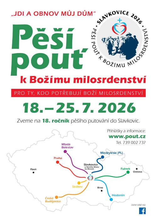 Tradiční pěší pouť do Slavkovic u Nového Města na Moravě k Božímu milosrdenství začíná v sobotu 18. července 2026 v ranních hodinách ze šesti různých míst: z Prahy, Mladé Boleslavi, Fulneku, Hodonína, Mezilesí v Polsku a Českých Budějovic.