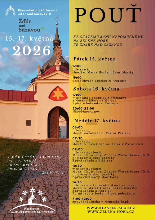 Římskokatolická farnost Žďár nad Sázavou zve na letošní pouť ke sv. Janu Nepomuckému na Zelené hoře. Pouť se uskuteční o třetím květnovém víkendu 15. - 17. května.