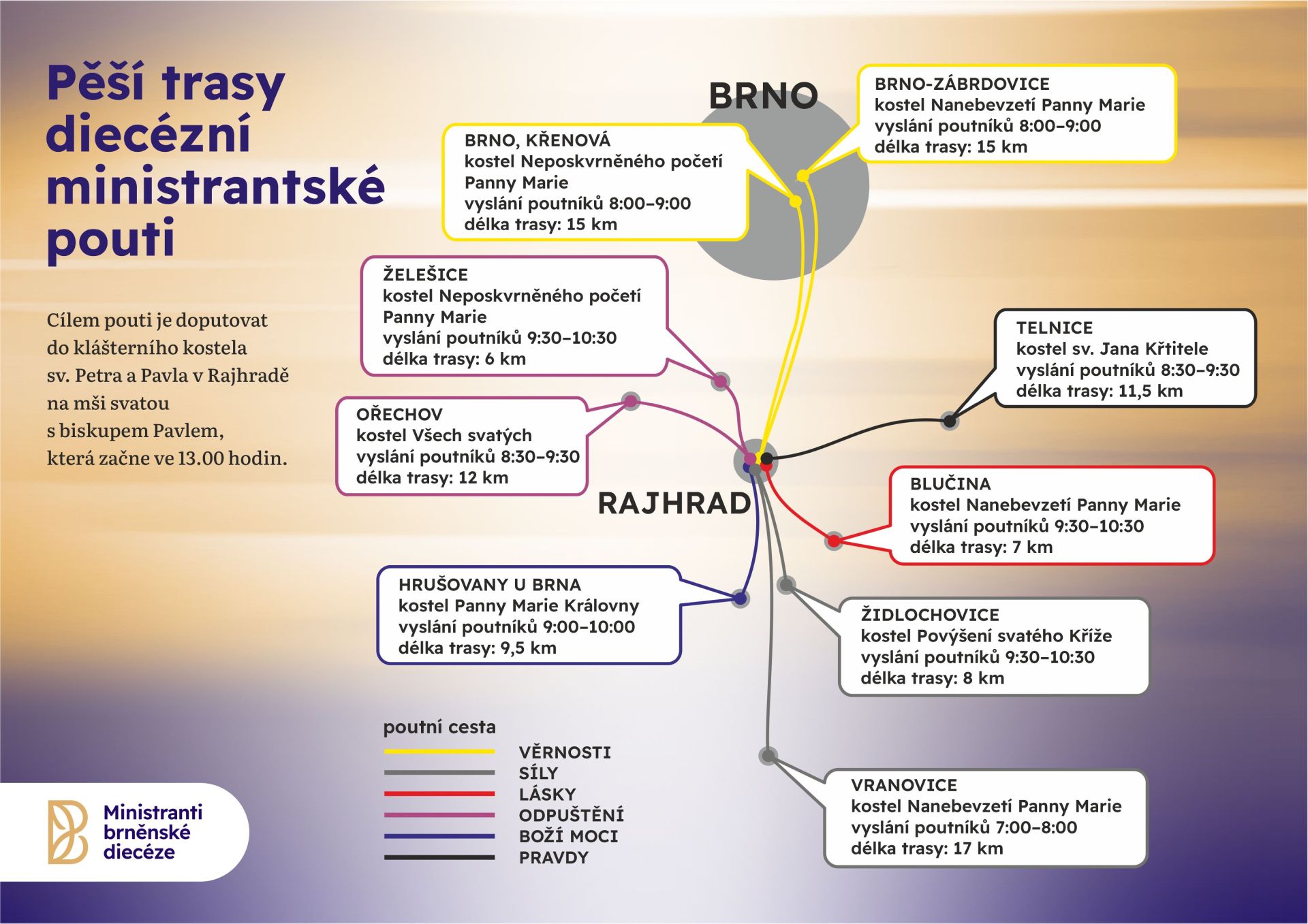 Diecézní pouť ministrantů - největší společná ministrantská akce v naší diecézi. K cíli poutě v benediktinském opatství povede 6 tématických cest (celkově devět pěších tras). Spolu s registrací na pouť bude možné si objednat vyšívané ministrantské tričko. Podrobné informace očekávejte na začátku roku 2026.