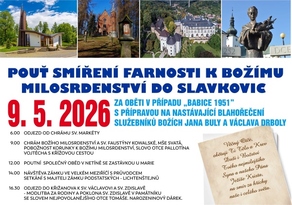 Farnost Jaroměřice nad Rokytnou bude putovat do poutní svatyně Božího milosrdenství ve Slavkovicích - za oběti babického případu s přípravou na blahořečení Jana Buly a Václava Drboly. Pouť smíření se koná v sobotu 9. května, odjezd od kostela sv. Markéty je v 6 hodin ráno.