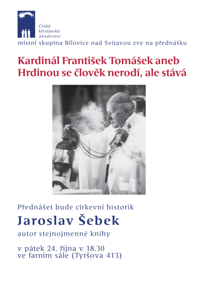 Místní skupina České křesťanské akademie v Bílovicích nad Svitavou zve na přednášku církevního historika Jaroslava Šebka o kardinálu Františku Tomáškovi. Přednáška proběhne v pátek 24. října ve farním sále na Tyršově ulici v 18.30.