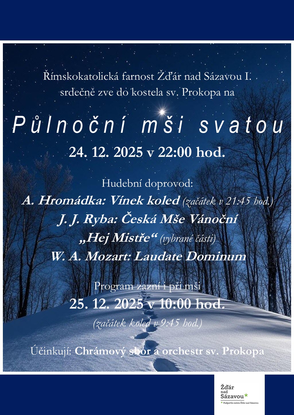 Římskokatolická farnost Žďár nad Sázavou I. zve na půlnoční mši svatou, kterou 24. 12. ve 22 hod. letošního roku doprovodí Chrámový pěvecký sbor sv. Prokopa Žďár nad Sázavou společně s komorním orchestrem. A kdo by už tou dobou náhodou spal, může využít druhé možnosti 25. 12. v 10 hodin.