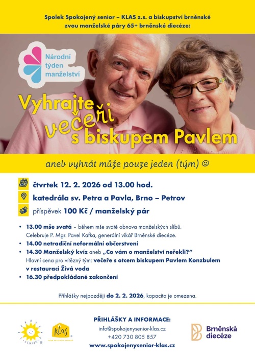 Mše svatá a manželský kvíz na téma „Co vám o manželství neřekli“ jsou na programu setkání manželských seniorských párů 65+ naší diecéze, které se uskuteční ve čtvrtek 12. února na Petrově. Akci pořádá spolek Spokojený senior – KLAS z.s. a Biskupství brněnské v rámci Národního týdne manželství.