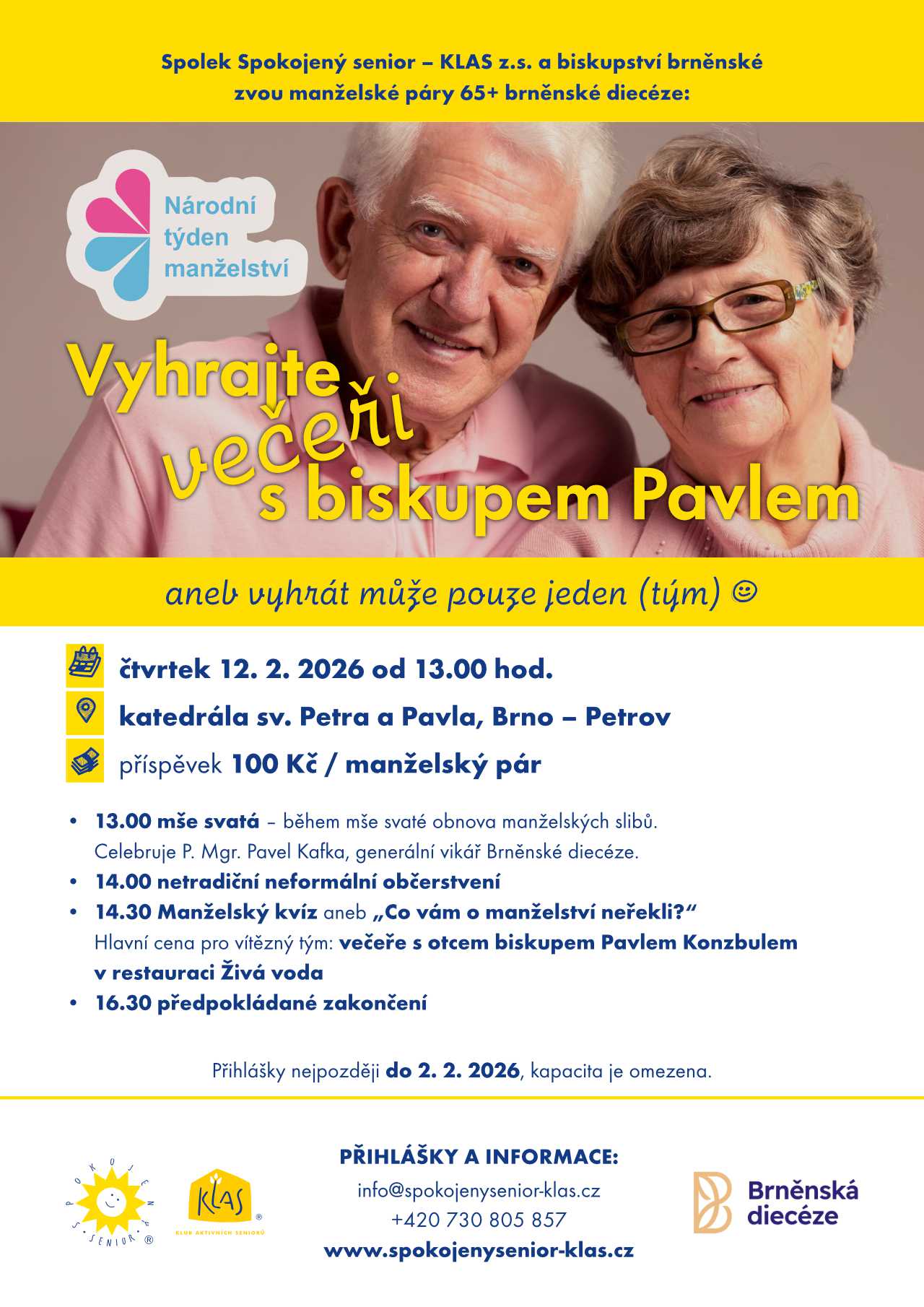 V rámci Národního týdne manželství zveme seniorské manželské páry naší diecéze (65+) na setkání, jehož součástí bude mše svatá s generálním vikářem diecéze P. Pavlem Kafkou a především manželský kvíz (obdoba tzv. hospodských kvízů) na téma: Co vám o manželství neřekli? Vítězný manželský pár čeká večeře s biskupem Pavlem Konzbulem.