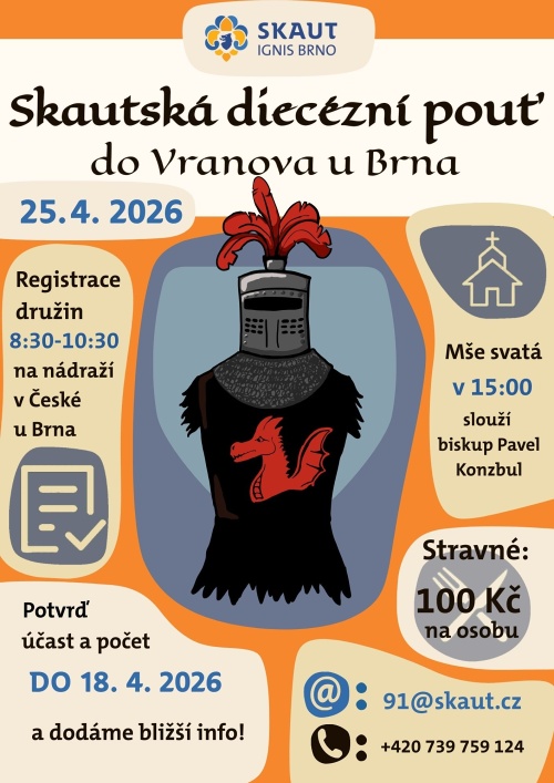 Všechny skauty a skautky zveme na diecézní pouť u příležitosti svátku sv. Jiří, patrona skautů. Letos proběhně na poutním místě Vranov u Brna, v sobotu 25. dubna. Mši svatou bude od 15 hodin sloužit biskup Pavel Konzbul.