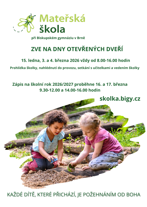 Školka nabízí dětem i rodičům rodinnou atmosféru, laskavý a respektující přístup a vzájemnou úctu vůči dětem i vůči dospělým. Součástí každodenního programu je nejen častý pobyt v přilehlém Wilsonově lese, ale také pestrá škála odpoledních kroužků či sezónní lyžování a plavání. Veronika Moravcová, jedna z třídních učitelek, doplňuje: „Učitelky a provozní, které zde pracují, jsou ženy s velikým srdcem a práci s dětmi považují za požehnání. A to prostupuje každý den. Významnou roli ve vzdělávání také hraje smíšený kolektiv ve třídách – děti se učí od sebe vzájemně, ať už napodobováním starších nebo trpělivostí s mladšími.“ Do školky na Biskupském gymnáziu loni v září nastoupila také čtyřletá Magdalenka. „Hledali jsme školku, kde budou mít paní učitelky pěkný přístup k dětem a budou je mít rády. Obešla jsem několik dnů otevřených dveří a na BiGy to na mě hned za chvilku působilo dobře. Dcera patří spíš mezi neposedné děti, tak pro nás bylo důležité také to, že školka je hned vedle lesa a děti mohou trávit hodně venku,“ vysvětluje volbu mateřinky Magdalenčina maminka.