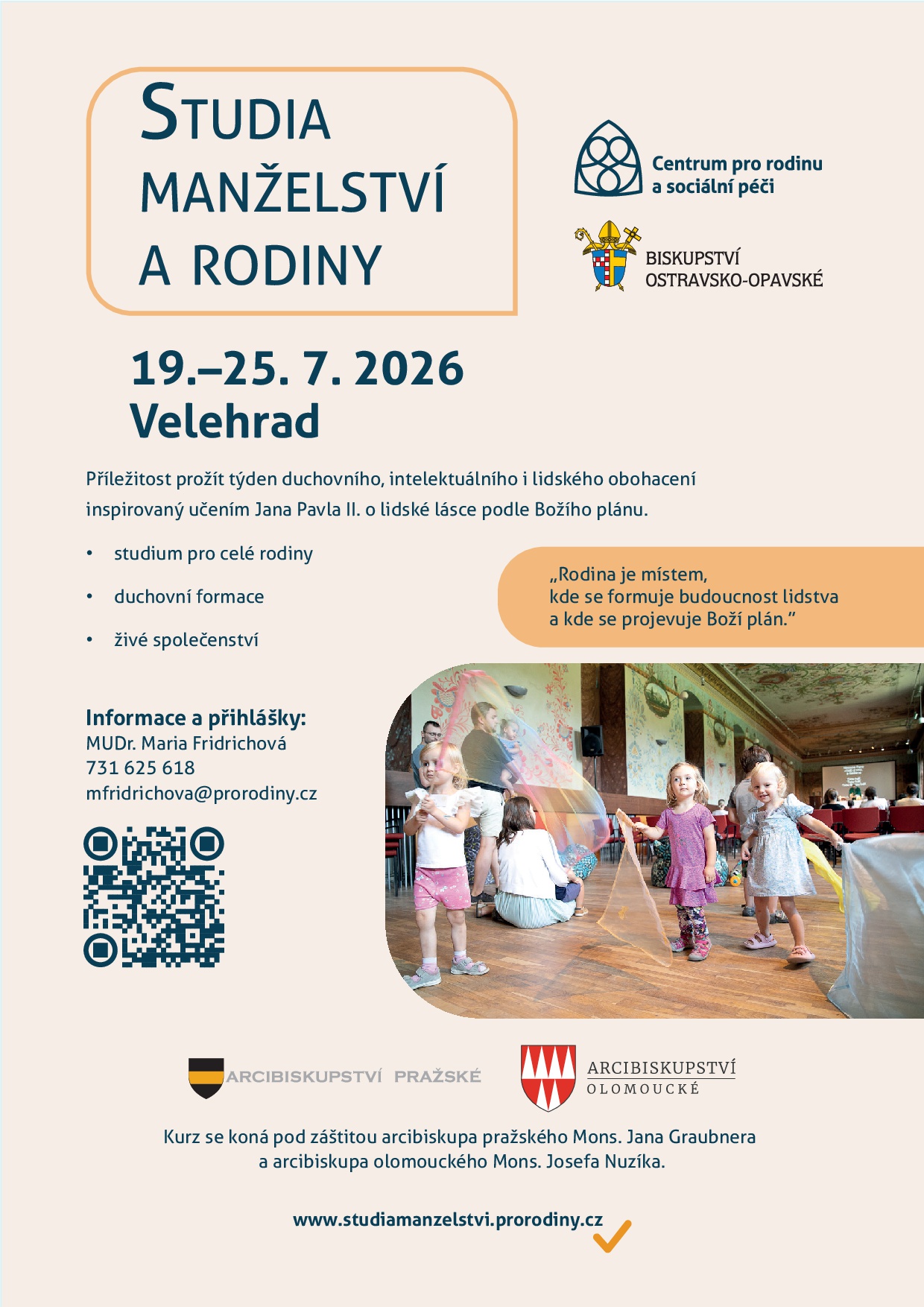 Rodina je místem, kde se formuje budoucnost lidstva a kde se projevuje Boží plán. Letní kurz Studií manželství a rodiny je připraven v termínu 19. – 25. 7. 2026, opět tradičně na Velehradě. Pro věřící manžele je to příležitost k rozvoji pravdivého, čistého a hlubokého uchopení života. Kurz má záštitu arcibiskupa pražského a primase českého Mons. Jana Graubnera a arcibiskupa olomouckého Mons. Josefa Nuzíka a také biskupa ostravsko-opavského Mons. Martina Davida. Pořádá Centrum pro rodinu a sociální péči z. s.