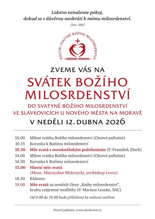 „Lidstvo nenalezne pokoj, dokud se s důvěrou neobrátí k mému milosrdenství...“ Jste zváni ke společnému slavení svátku Božího milosrdenství v neděli 12. dubna 2026 do Slavkovic.