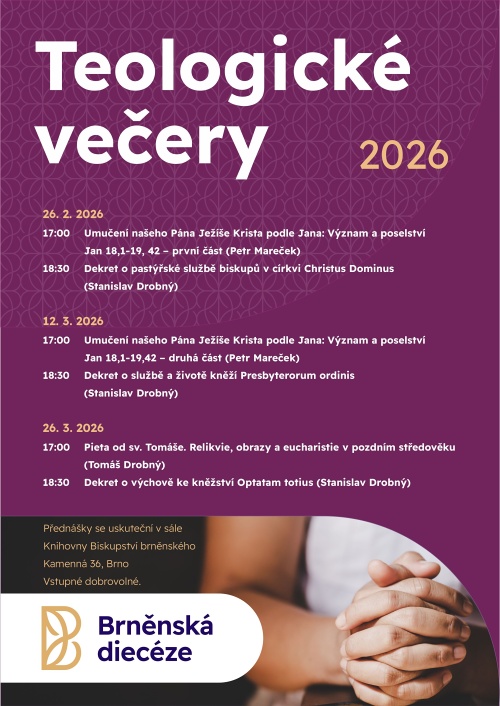 Teologické večery budou na jaře 2026 probíhat v Knihovně Biskupství brněnského na Kamenné ulici. Začínají 26. února (12. března, 26. března) vždy v 17.00. Vstupné dobrovolné.