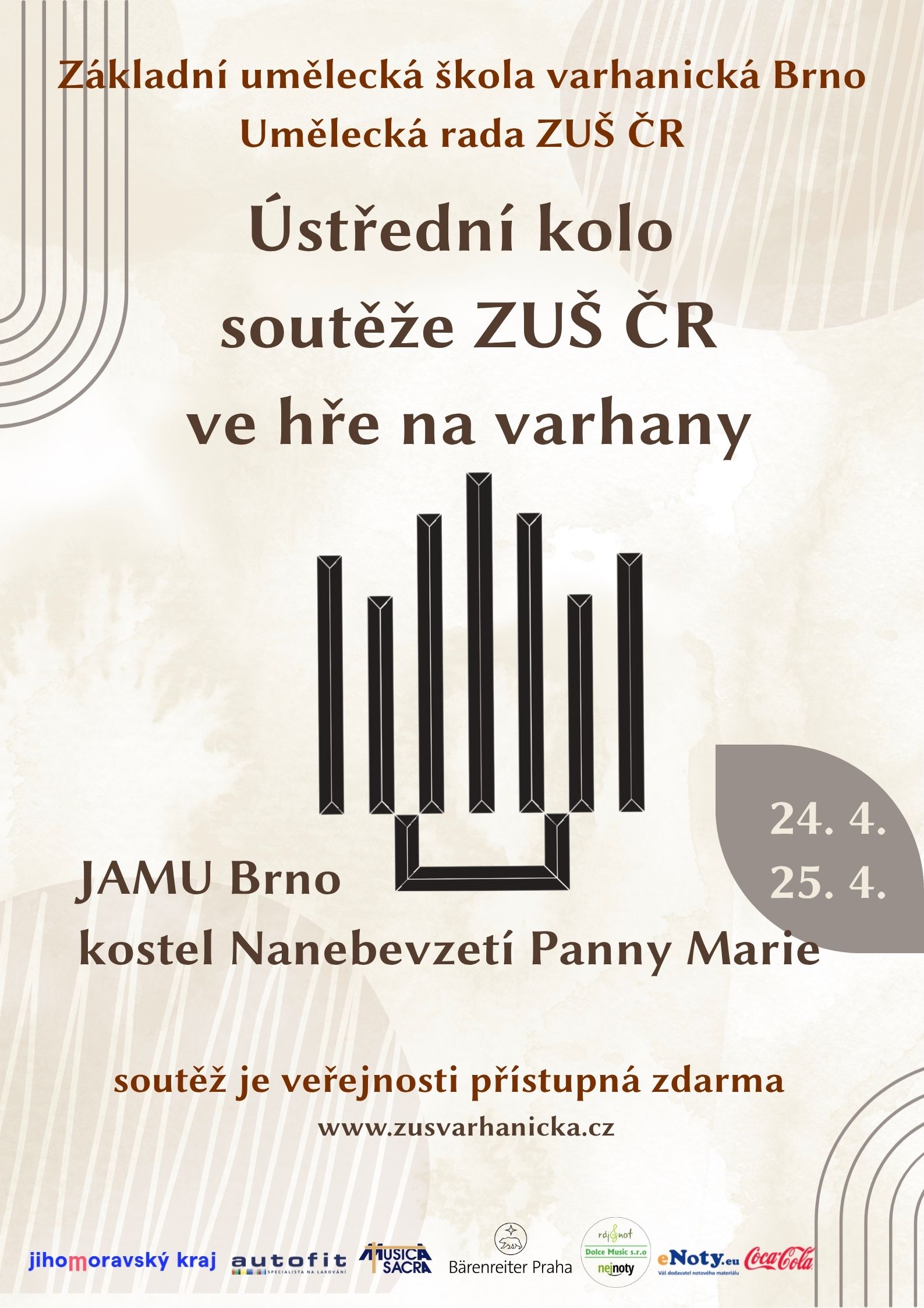 - III. a IV. kategorie budou probíhat v sobotu 25. 4. 2026 v kostele Nanebevzetí Panny Marie, Jezuitská 2. Vyhlášení výsledků bude na ZUŠ varhanické cca v 17:00.