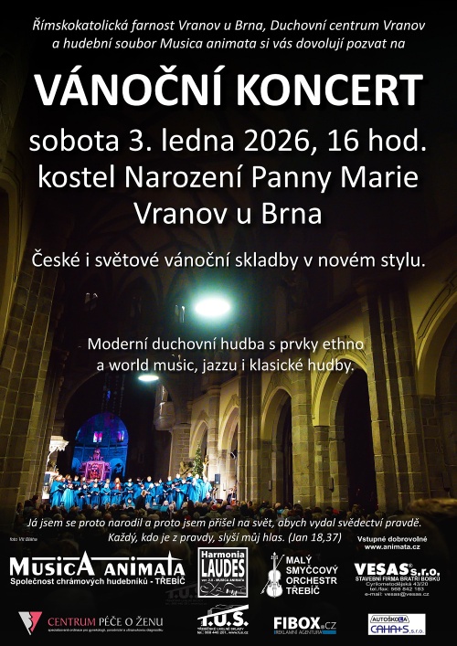 Římskokatolická farnost Vranov u Brna, Duchovní Centrum Vranov a hudební soubor Musica animata si vás dovolují pozvat na VÁNOČNÍ KONCERT v sobotu 3. ledna 2026, 16 hod., kostel Narození Panny Marie, Vranov u Brna.