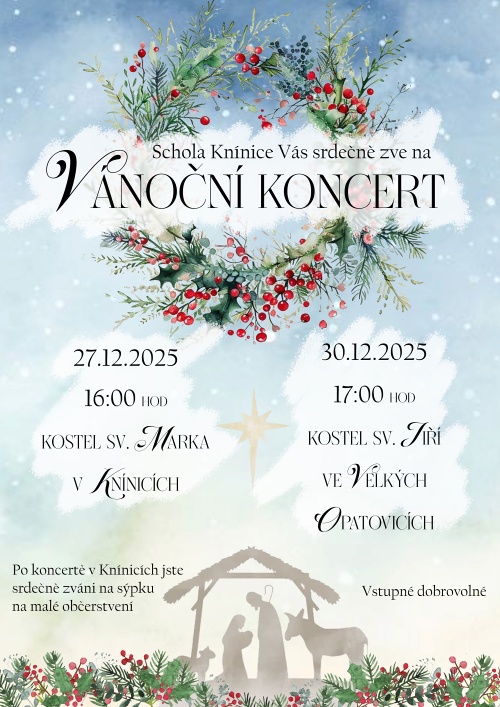 Schola v Knínicích zve v sobotu 27. prosince v 16 hodin do kostela sv. Marka na vánoční koncert se scénkou dětí z knínické farnosti. Vstupné dobrovolné. Více informací ZDE.