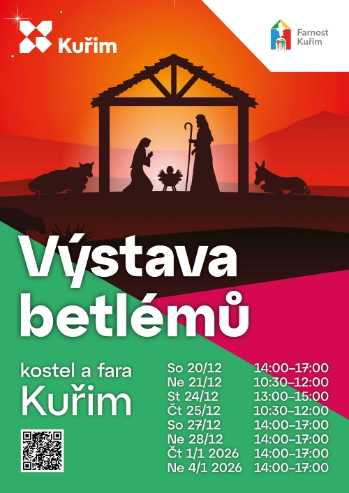 Zveme vás na 6. ročník tradiční výstavy betlémů v kuřimském kostele a nově i na faře. Můžete se těšit na betlémy od uznávaných betlemářů, doplněné o betlémy vytvořené v základních a mateřských školách v Kuřimi a blízkém okolí a betlémy od kuřimských občanů a spolků. Velkou novinkou je výstava na faře, která má název „Betlémy ze sbírky Zdeňka Jílka a jeho přátel“.
