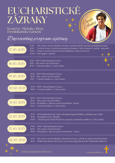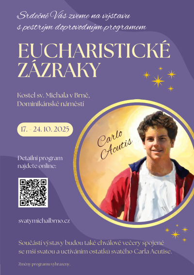 Zveme vás na výjimečný týden plný duchovní hloubky a milosti. Od 17. do 24. října se v Brně uskuteční Eucharistická výstava inspirovaná životem Carla Acutise, mladého blahoslaveného, jehož láska k Eucharistii oslovila celý svět. Součástí programu budou chvály, mše svaté, přednášky a také uctívání ostatků Carla Acutise, které přinesou prostor k modlitbě, ztišení i duchovnímu povzbuzení. Vše vyvrcholí v kostele sv. Michala, kde vás srdečně zveme k prožití hlubokého duchovního společenství. Přijďte se nechat inspirovat vírou, která překračuje čas – vírou, kterou žil Carlo Acutis.