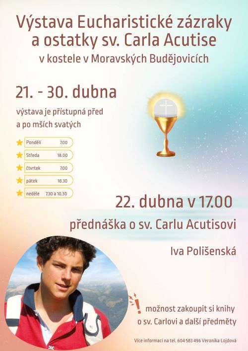 Do kostela v Moravských Budějovicích jste zváni na výstavu Eucharistické zázraky a ostatky sv. Carla Acutise. Výstava probíhá od 21. do 30. dubna a je přístupná před a po mších svatých (viz plakátek). Ve středu 22. dubna v 18.00 proběhne také přednáška o sv. Carlu Acutisovi, vystoupí Iva Polišenská.