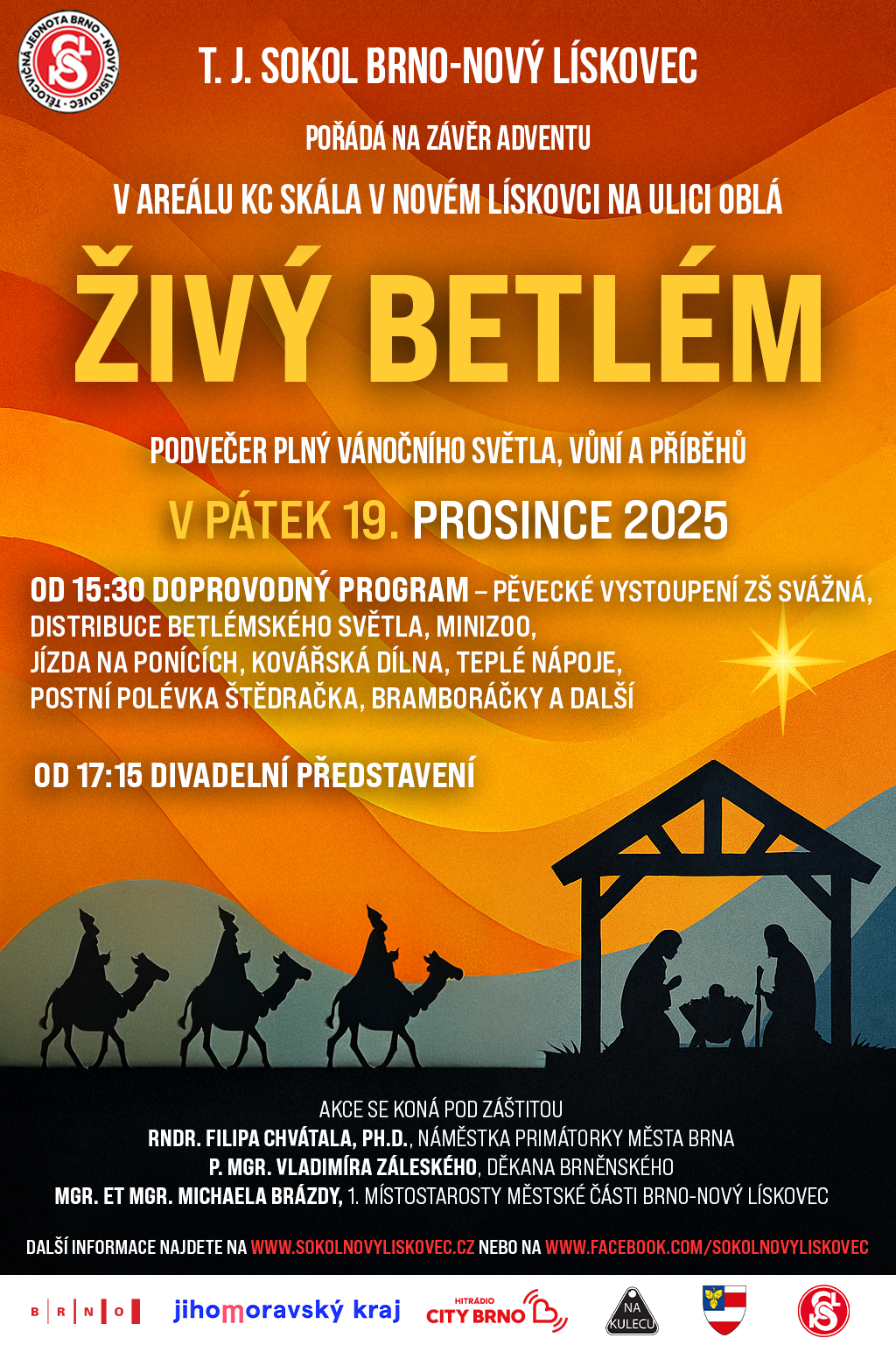 Advent v Novém Lískovci vrcholí – pojďme opět společně k jesličkám. Od roku 2017 připravuje Tělocvičná jednota Sokol Brno-Nový Lískovec jedinečný Živý betlém, který nemá v širokém okolí obdoby. Na samém konci adventu, vždy pod večerní oblohou, ožívá v podání místních amatérských herců biblický příběh o cestě do Betléma a o narození Ježíše – s opravdovým živým děťátkem v jesličkách, se zvířaty, zpívanými koledami, trubači i svátečním slovem duchovního.